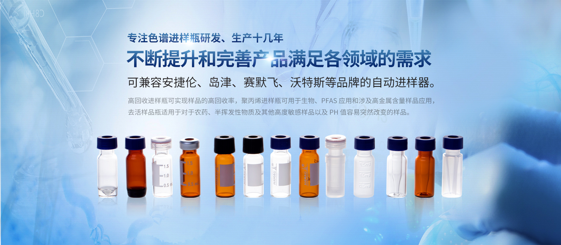 浙江哈邁科技有限公司(簡稱HAMAG),成立于2005年,總部位于美麗的海濱城市寧波,是中國優(yōu)質色譜進樣瓶、樣品瓶供應商,是一家專業(yè)從事色譜耗材的科研、設計、生產(chǎn)、銷售和系統(tǒng)集成為一體的生產(chǎn)型企業(yè)。經(jīng)過十幾年的研發(fā)與努力,通過和國內外多個科研部門,浙江大學理工學院,同時與品牌:安捷倫、沃特世、島津等公司的技術交流與學習,我們成功的研制開發(fā)出實驗室分析設備專用的各種型號的自動進樣瓶、頂空瓶及其配套蓋墊;特氟龍與硅膠復合墊片;特氟龍/硅膠制品;創(chuàng)新型固相萃取儀;針式過濾器等幾十種實驗室耗材及關聯(lián)產(chǎn)品...